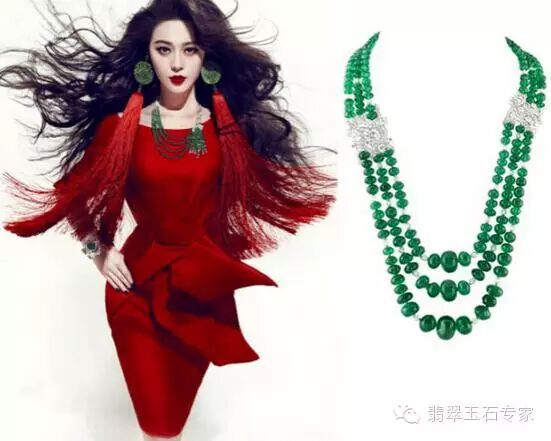 晶莹剔透,毫无疑问高白冰起荧光翡翠项链、耳环,仅项链就至少价值百万,雅典大方又不失贵气。