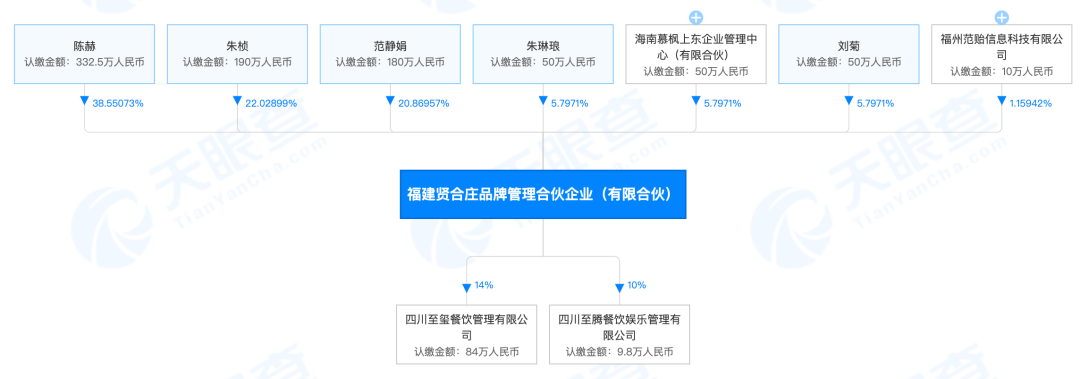 2020年1月份,福建贤合庄的工商信息显示,陈赫、朱桢、叶一茜从股东中退出,大股东从陈赫变更为福建贤合庄品牌管理合伙企业(有限合伙)。在这家公司中,陈赫持股38.55%,为第一大股东,朱桢持股22.01%。