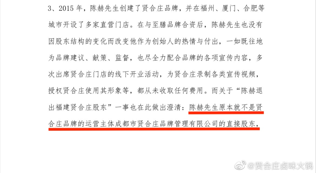 在相关声明中,成都贤合庄对关于“陈赫退出福建贤合庄股东”一事作出澄清:此前陈赫持股的福建贤合庄公司,自2019年不再直接经营贤合庄品牌后,已经将主营方向调整为对外投资,并且涉及除餐饮外的多个领域。