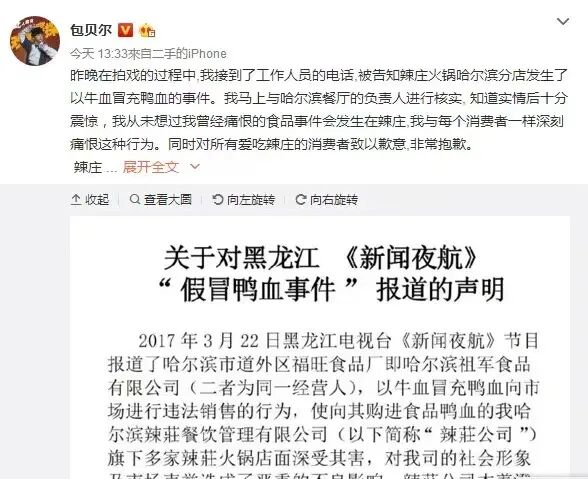 辣庄火锅发生“假冒鸭血事件”之后,合伙参与投资的包贝尔在微博上致歉。/微博@包贝尔