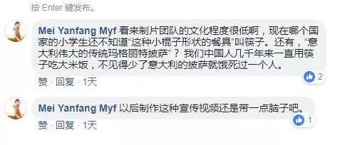 @网友Mei Yanfang Myf: 看来制片团队的文化程度很低啊,现在哪个国家的小学生还不知道“这种小棍子形状的餐具”叫筷子。还有,“意大利伟大的传统玛格丽特披萨”?我们中国人几千年来一直用筷子吃大米饭,不见得少了意大利的披萨就饿死过一个人。