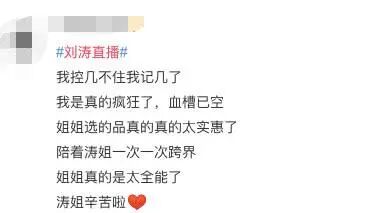 大家对于刘涛的直播还是蛮认可的,主要是她的功课做得很足,私底下也是下了功夫的。而且整体上氛围都很轻松愉悦,再加上涛姐连续四个小时一直都在笑着直播,而且是不停地说着话,确实相当敬业了,很厉害。