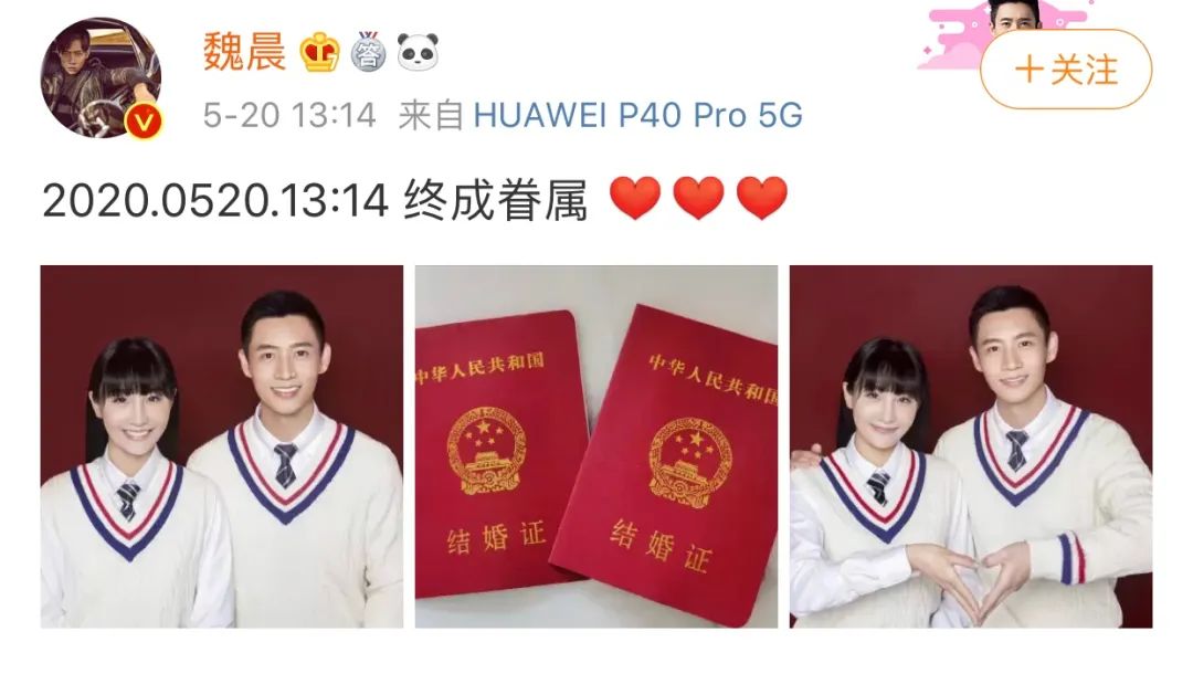 从大学到步入社会,从校服到婚纱。在对方生日当天求婚,在2020年5月20日领证,在13点14分官宣。