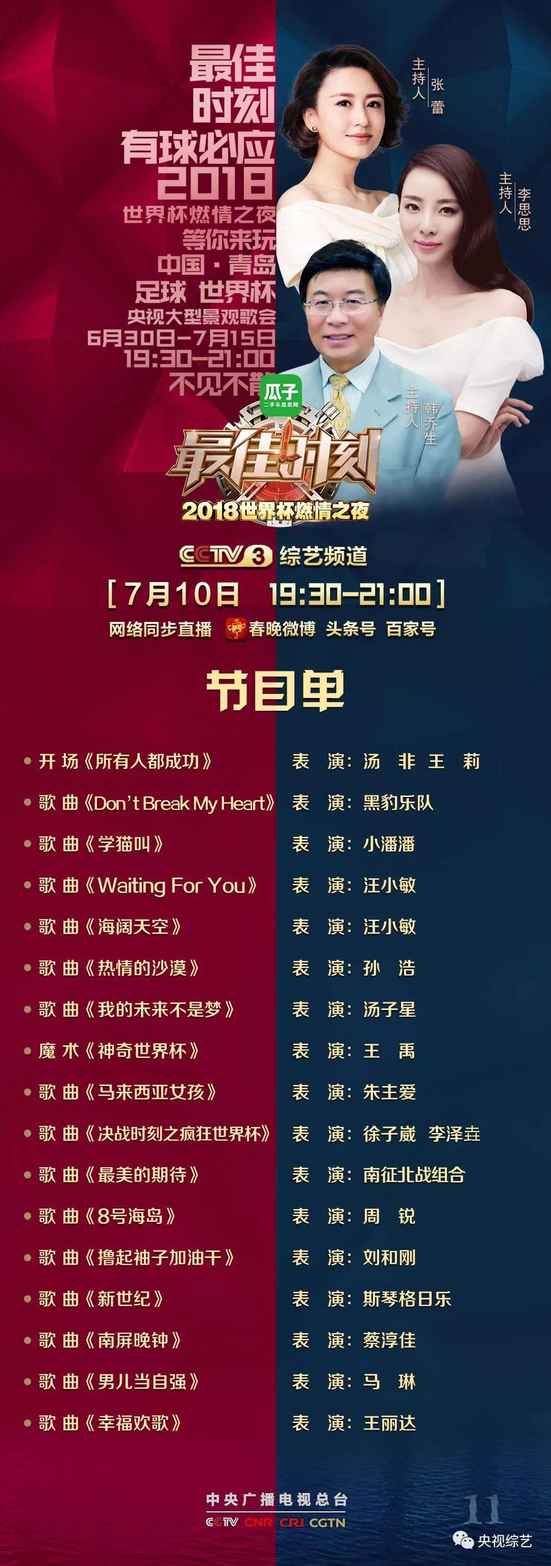 燃情今夏,精彩继续!李思思、张蕾、韩乔生向你发出甜蜜邀约!期待指数爆表,黑豹乐队、孙浩、斯琴格日乐、蔡淳佳、王丽达等一起唱出最好的期待,邀你相约世界杯燃情之夜,助力世界杯!