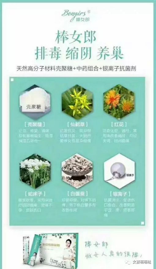 老包装棒女郎是纯中药成分,一盒6只;新款明星版棒女郎,中药成分加壳聚糖,一盒5只。