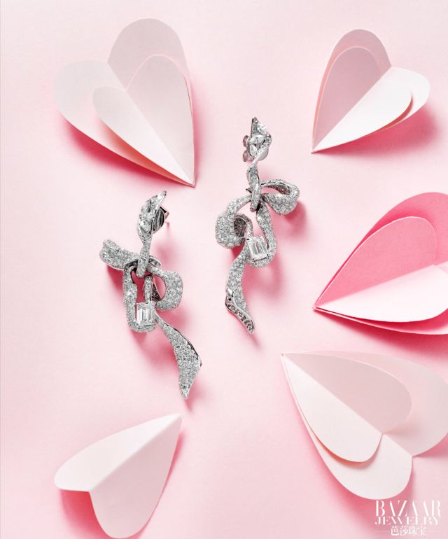 18K白金镶2颗2.14克拉祖母绿式切割白钻、6颗马眼式切割白钻、1,139颗白钻配石耳环