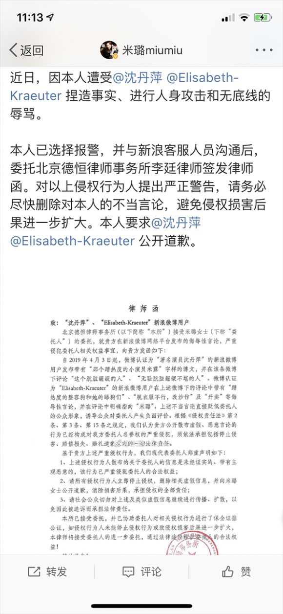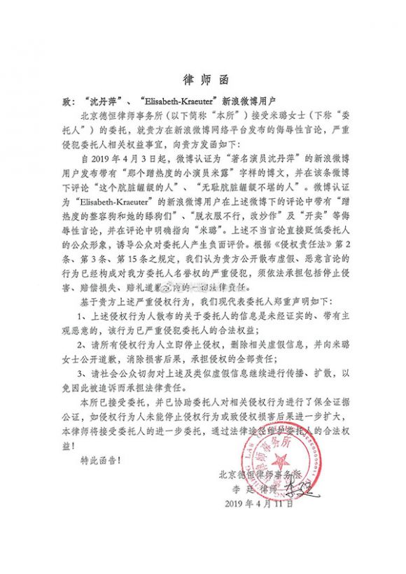 在种种污蔑和挑衅下,米璐忍无可忍,终于在4月10日发出声明表明已将此事已报警处理,4月11日在微博向沈丹萍母女发布李廷律师出具的律师函,将此事全权交由北京德恒律师事务所处理。