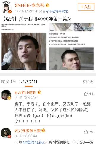 13年李艺彤刚入团的时候是仅仅是替补成员,没公演没外务,窝在宿舍吃泡面,靠长微博和粉丝交流,还被媒体当成是队友鞠婧祎整容前的样子。但是她的一篇澄清文“关于我和4000年第一美女”,在当时转发过万,在那时候48知名度还没有现在这么高,她也一举成为48的第二大流量