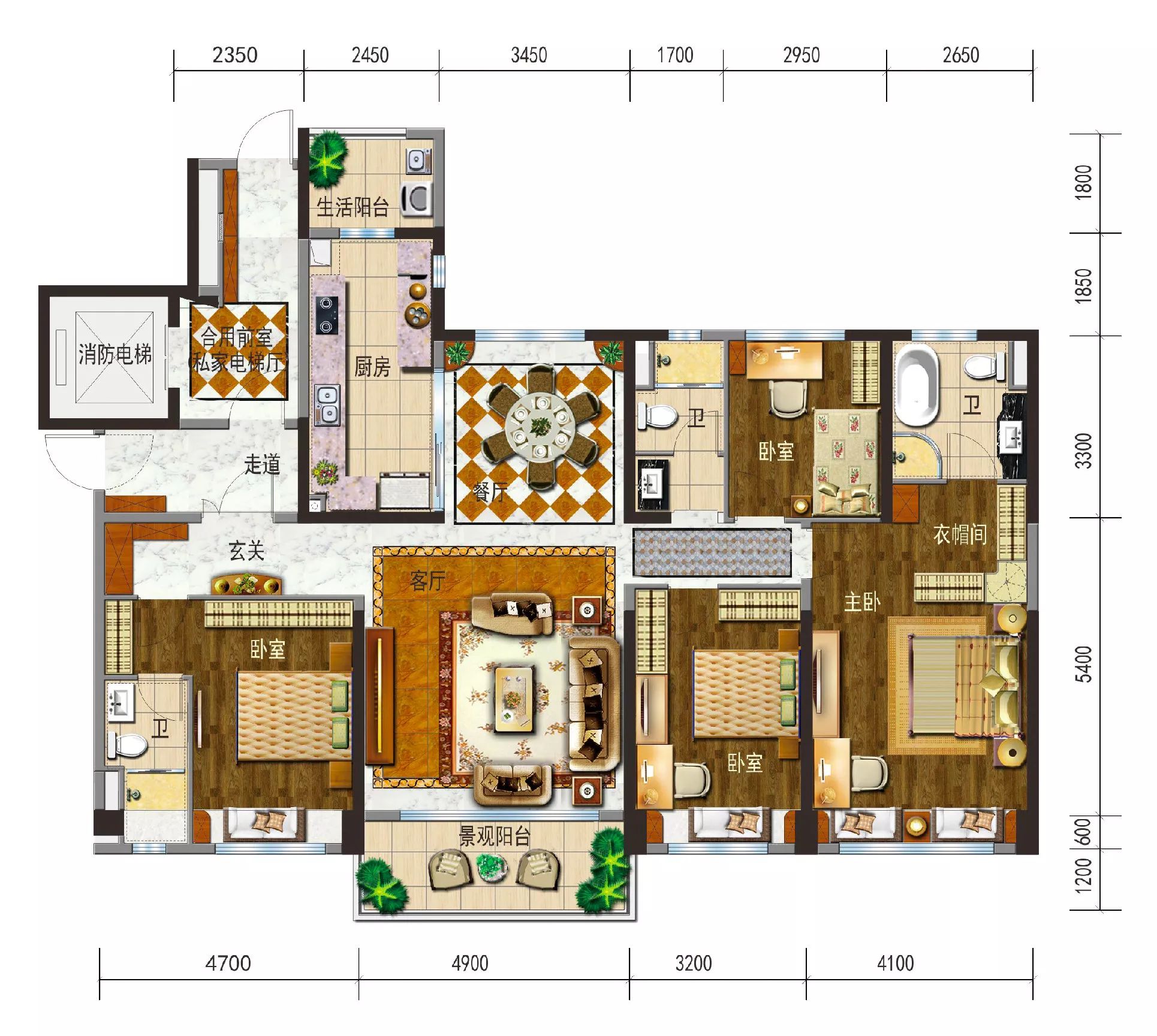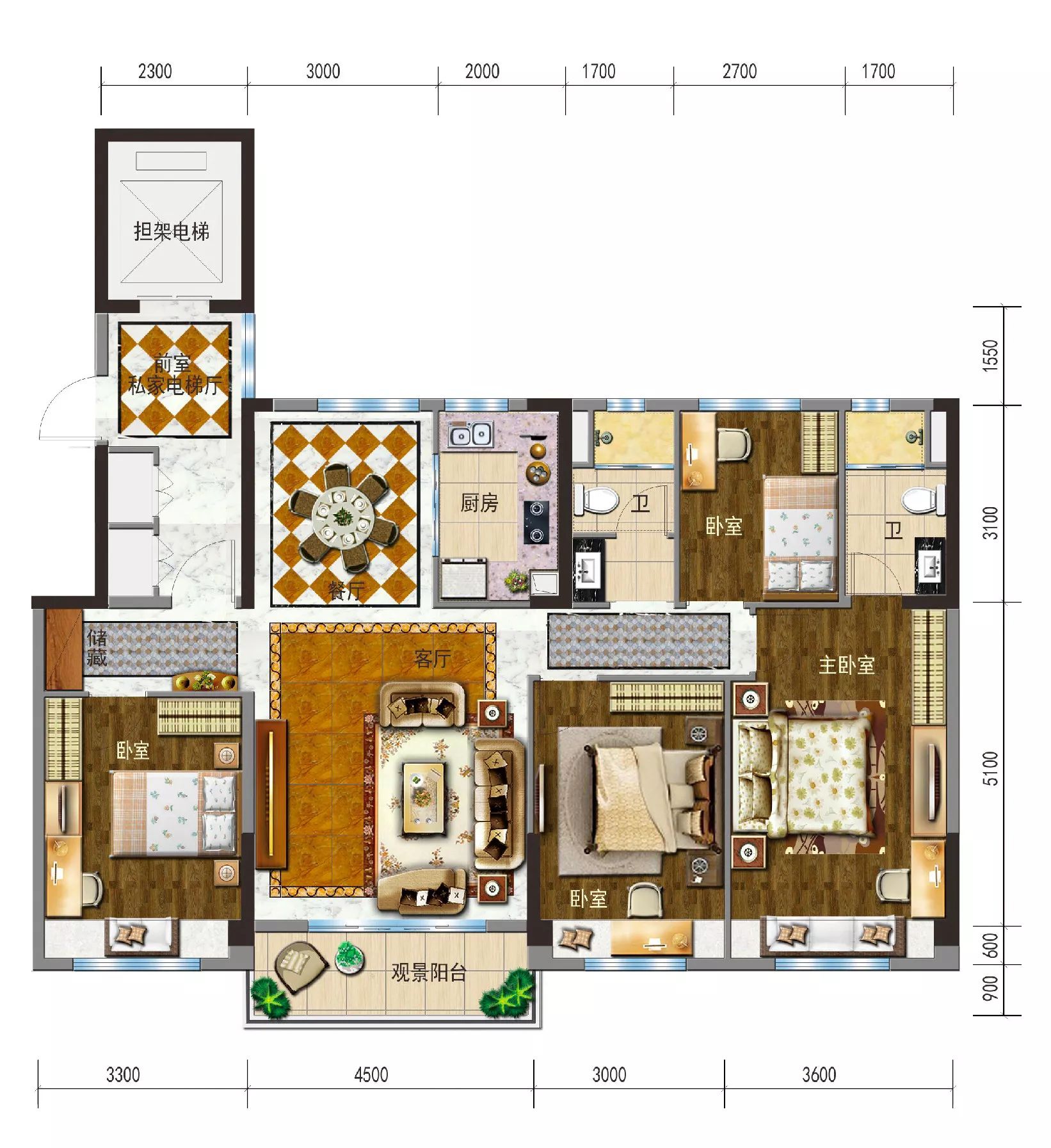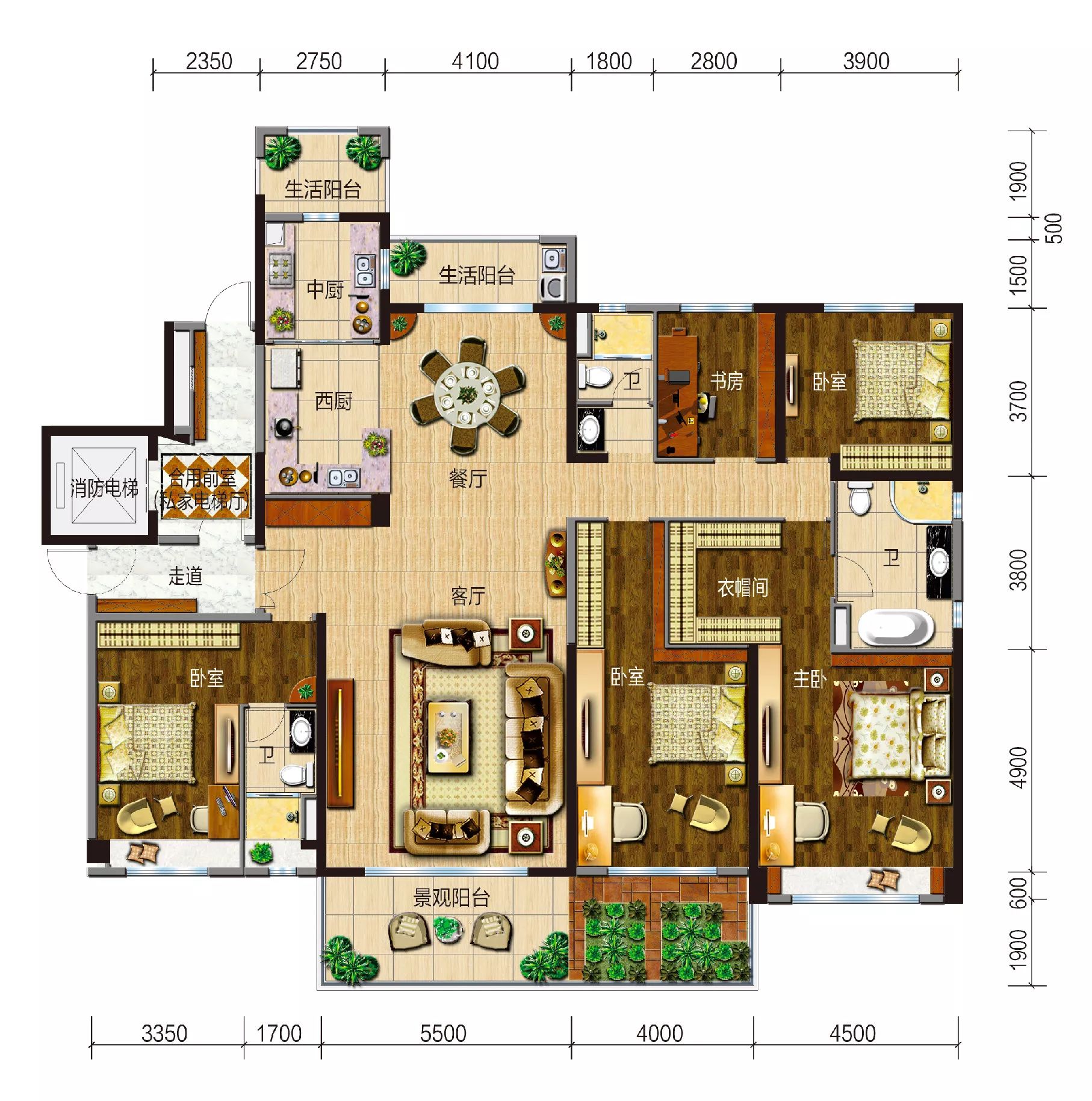 建面约277㎡(5房2厅3卫2厨2阳台)