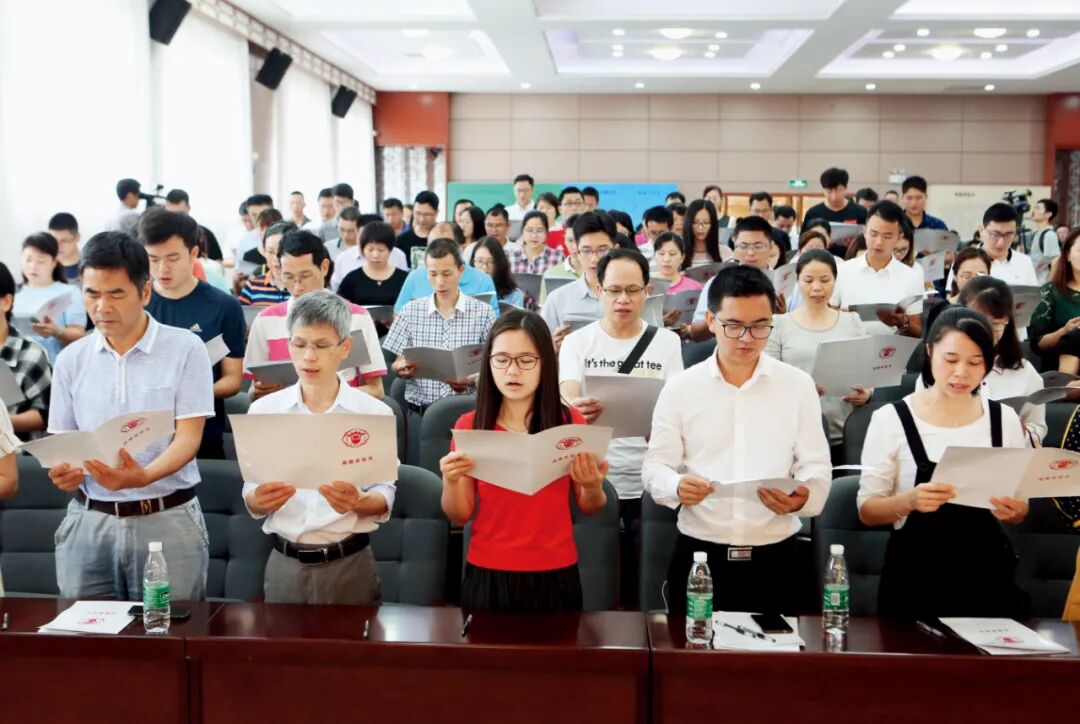 2018年5月6日,广东广州市,120名中学生教师代表集体宣读并签署《师德承诺书》,承诺杜绝“非零起点教学”“超纲教学”“强化应试”“课上不讲课后讲”等不良行为,自觉抵制有偿办班补课及家教,不参加校外机构兼课与兼职。图/视觉中国