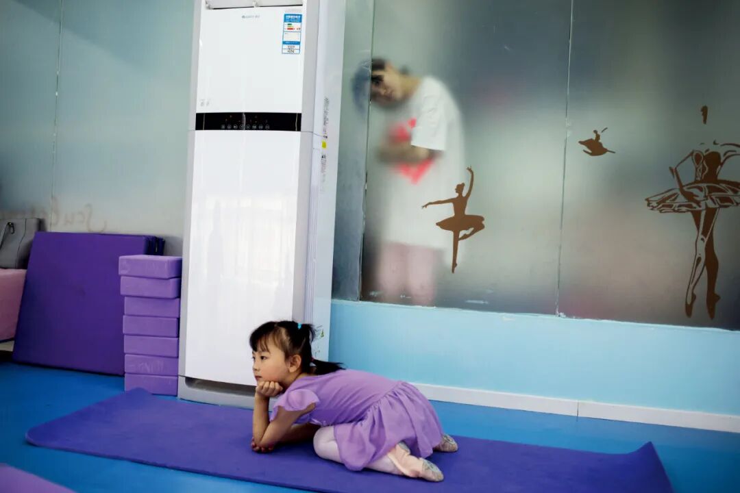 2018年5月26日,北京海淀区一家教育机构内,家长隔着玻璃墙观看教室内的舞蹈课。图/视觉中国