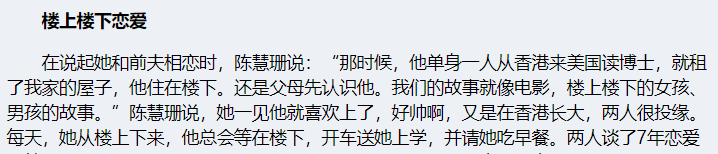 信息显示:陈慧珊毕业于美国波士顿学院传播系,目前是香港大学教育学院(英语系)在读博士。