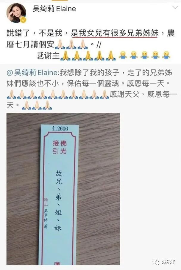 不少网友以为她是为自己的亲友做超度法事,但吴绮莉却留言表示:“说错了,不是我,是我女儿有很多兄弟姐妹,农历七月请个安。”