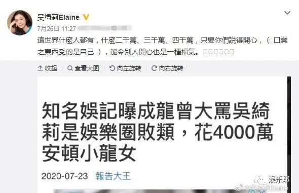 所以早前,有消息指“成龙曾大骂吴绮莉是娱乐圈败类,花4000万安顿小龙女”时,吴绮莉曾在社交网辟谣: