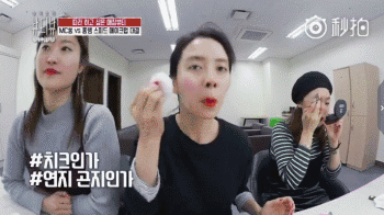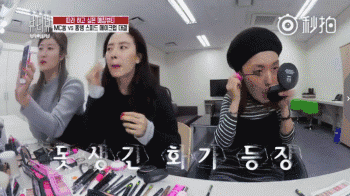 第四集的主题是快速化妆,一开始智孝就被要求和另一个女主持先进行10分钟快速化妆对决。不得不说,懵智没有上底妆皮肤也超好的啊,和左边那位画了妆的妹子比也没差的啊!