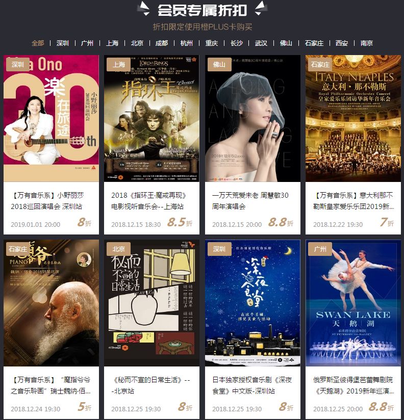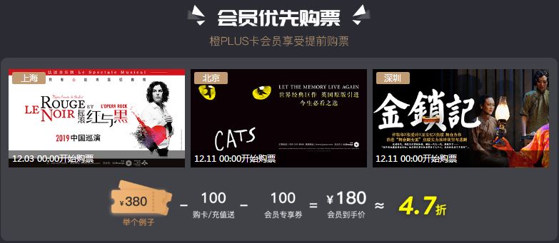 19年原版音乐剧《猫》、《红与黑》,以及深圳城市戏剧节等重点项目,在公售前,橙PLUS会员专享提前购票,可使用双12橙PLUS会员专享券(早鸟折扣不可与优惠券叠加使用)