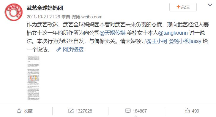 感受到潜在危险的粉丝们发动了“捣姜事件”(抵制经纪人姜x),当时作为顶级流量,关于武艺的这条微博在一小时内转发百万。