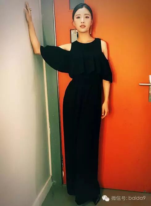 张杨果而的这身黑色露肩连体裤,休闲时尚又能展现她的高挑身材,荷叶边袖子的设计又增添了不少甜美可人,很有魅力!