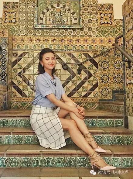 在这充满异国风情的背景下,张杨果而就更加显得有韵味了,穿着蓝色衬衫和格纹短裙,前开衩的设计隐约秀出修长美腿,搭配粉色高跟凉鞋很有女性魅力。