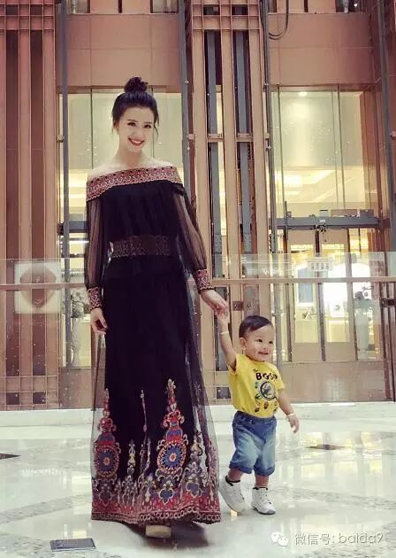 “辣妈”自从带上儿子之后就变“萌妈”了,一身黑色民族风长裙简直美到不行,一字肩不仅秀出香肩还衬托得脸蛋更精致了,这“萌娃”与甜馨有得比啊,好口爱~