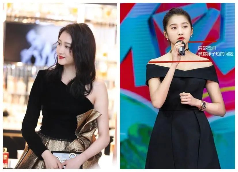 脖子短的女生穿一字肩会放大脖子短的问题,还会显得上身粗壮。就拿关晓彤这两张图来说,身穿一字肩短裙的她暴露了肩部圆润的问题,整个肩部也显得很宽,脖子更不用说了,又粗又短。而只露出一边胳膊的她就可以明显看出没有太多问题。