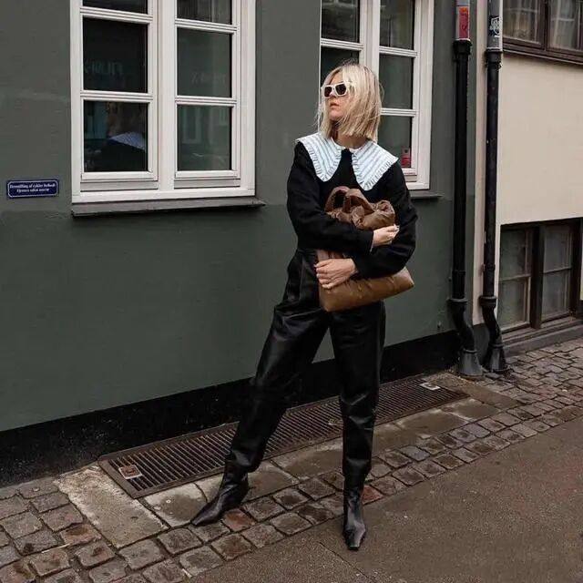 领口过于繁复的设计对短脖子星人来说也不太友好。例如娃娃领,这种略带弧度的翻领设计加厚了肩线和颈线交接处的弧度,会显得整个肩部看起来更圆润,而且露出的颈部皮肤面积也相对较少就会显得脖子又短又粗。