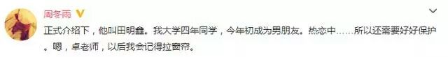 当时周冬雨和男朋友田明鑫一同去三亚别墅度假,由于没拉窗帘被拍到,随后恋情曝光;消息一出,周冬雨很是爽快,立刻承认。