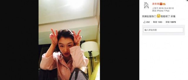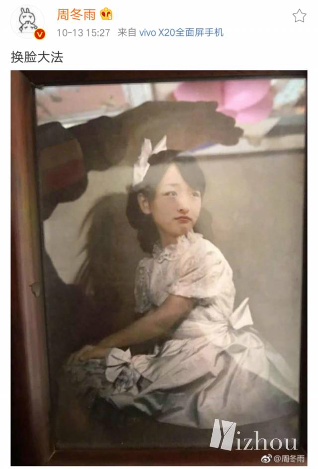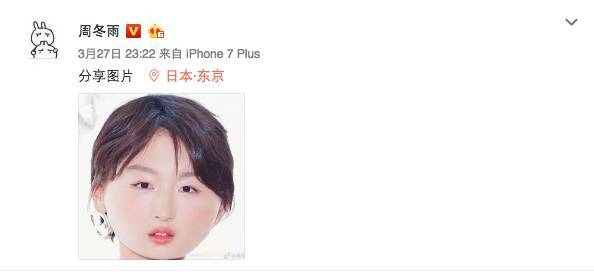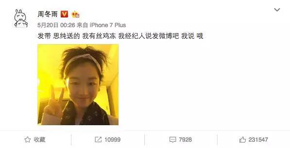 这发带···总有种似曾相识的感觉。能直接把刘海掀起来这么发微博,女艺人里估计周冬雨还是第一个。