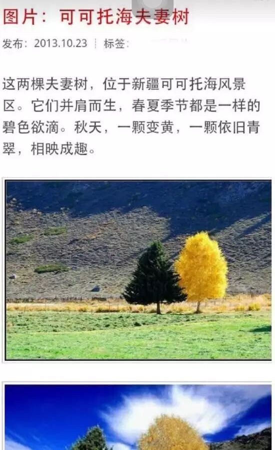 两棵夫妻树位于新疆可可托海风景区。它们并肩而生,春夏季节都是一样的碧色欲滴,秋天,一颗变黄,一颗依旧青翠,相映成趣。