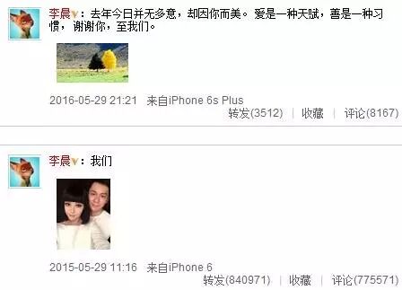 29号晚上21:21,李晨发微博纪念和范冰冰公布恋情一周年,晒夫妻树示爱女友,写道:“去年今日并无多意,却因你而美。爱是一种天赋,善是一种习惯,谢谢你,至我们。”并附上可可托海夫妻树的照片。