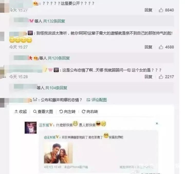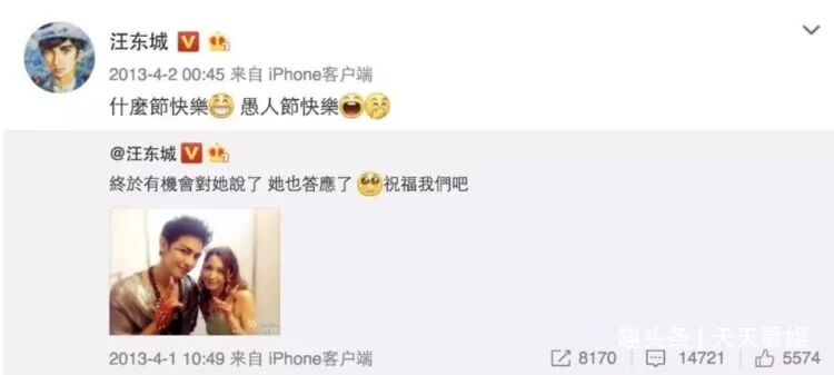 其实汪东城和藤井莉娜这段感情早已有预兆。2013年4月1日愚人节前一天,汪东城社交平台分享一张和藤井莉娜的合照,并配文终于有机会对她说了,她也答应了,祝福我们吧,4月2日愚人节还特意转发,让网友都以为他是开玩笑,没想到过了5年才官宣。
