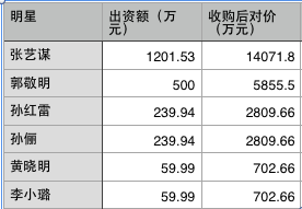 不会突击投资的明星不是好股东!除了张艺谋、郭敬明之外,从中受益的还有孙红雷、孙俪、黄晓明、李小璐等。见下图↓↓↓