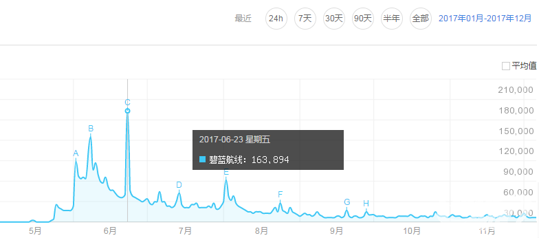3. 百度指数:《碧蓝航线》在6月23日百指达到最高的163894,而非公测当天的6月2日(百指:90994)。该游戏从5月25日苹果版本上线、6月2日全平台测试一直到6月底一直保持着非常高的百指(均值在5~7w之间)。目前平静期的百指维持在1w左右。