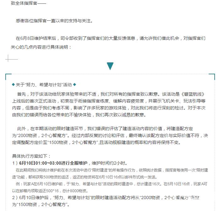公测之后,官方开启了“努力、希望与计划”活动,但该活动由于设计问题,影响了很多用户的游戏体验。此事件一经发生,《碧蓝航线》立刻通过官方渠道发布了道歉声明和补偿措施。这“隆重”的道歉举动为了游戏圈粉无数,不但及时的解决了此次危机事件,还得到玩家的理解和声援。