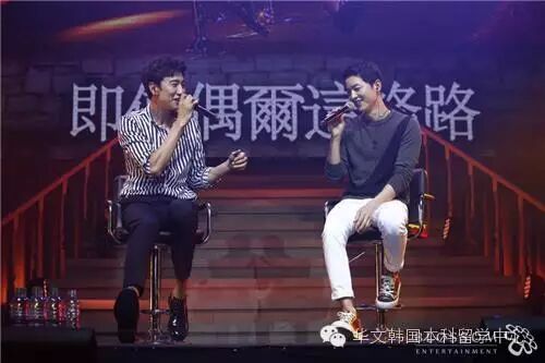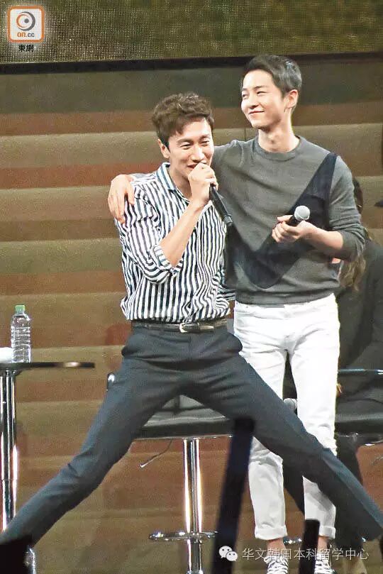 李光洙把腿分开与宋仲基合照。 新浪娱乐讯 北京时间6月12日消息,据香港媒体报导,凭韩剧《太阳的后裔》气势如虹的男神宋仲基,昨晚(6月11日)在亚博举行香港见面会,邀请私交甚笃的韩星李光洙担任嘉宾,玩游戏时抽中吃榴莲的宋仲基被臭得想吐出来,还喂李光洙分甘同“臭”,两男还戴假发合照。 男神宋仲基的香港见面会昨晚8时许开锣,由DJ艺人森美担任主持,宋仲基透露抵达香港后,前晚(6月10日)曾去兰桂坊酒吧,他表示成年后首次外游就是去香港,乘坐双层巴士及山顶缆车,还跟森美学讲广东话:“你坏人!”场面搞笑。他透露喜欢吃豆腐,并用普通话赞港迷“完美”,谈及理想型时,表示喜欢聪明、善良及说话小声的女人,台下粉丝大喊“宋慧乔”,他即以普通话赞宋慧乔漂亮,还说他自己不会太强势、性格较独立,但会照顾女友。 泰国游分房睡 宋仲基在现场抽出5名粉丝重演《太后》经典场面,透露剧中最浪漫是接吻场面,而最多NG则是帮乔妹扎头发的一幕,其间与女粉丝互贴心心贴纸,令女方激动落泪。其后李光洙登场,宋仲基自言两人一星期聊一次电话,还透露李光洙客串《太后》时经常重拍,李光洙立刻摆手摇头否认。提及两人曾一起去泰国旅行,但澄清是分房睡的。玩了抛球及斗鸡游戏后,宋仲基抽中吃榴莲,却吃到想吐出来,之后亲自喂李光洙吃,而玩输游戏的他被罚要戴上长假发,他还挨着李光洙的肩膀合照。 王祖蓝惊喜现身 除了与李光洙即场合唱一曲,宋仲基也获金宇彬、赵寅成及金钟国等好友录短片打气,他演唱陈奕迅的国语歌《好久不见》,并向粉丝送曲奇。另外,曾跟宋仲基录影内地节目《奔跑吧兄弟》的王祖蓝惊喜上台,而雷颂德的太太及徐濠萦也有捧场。(颖颖) |