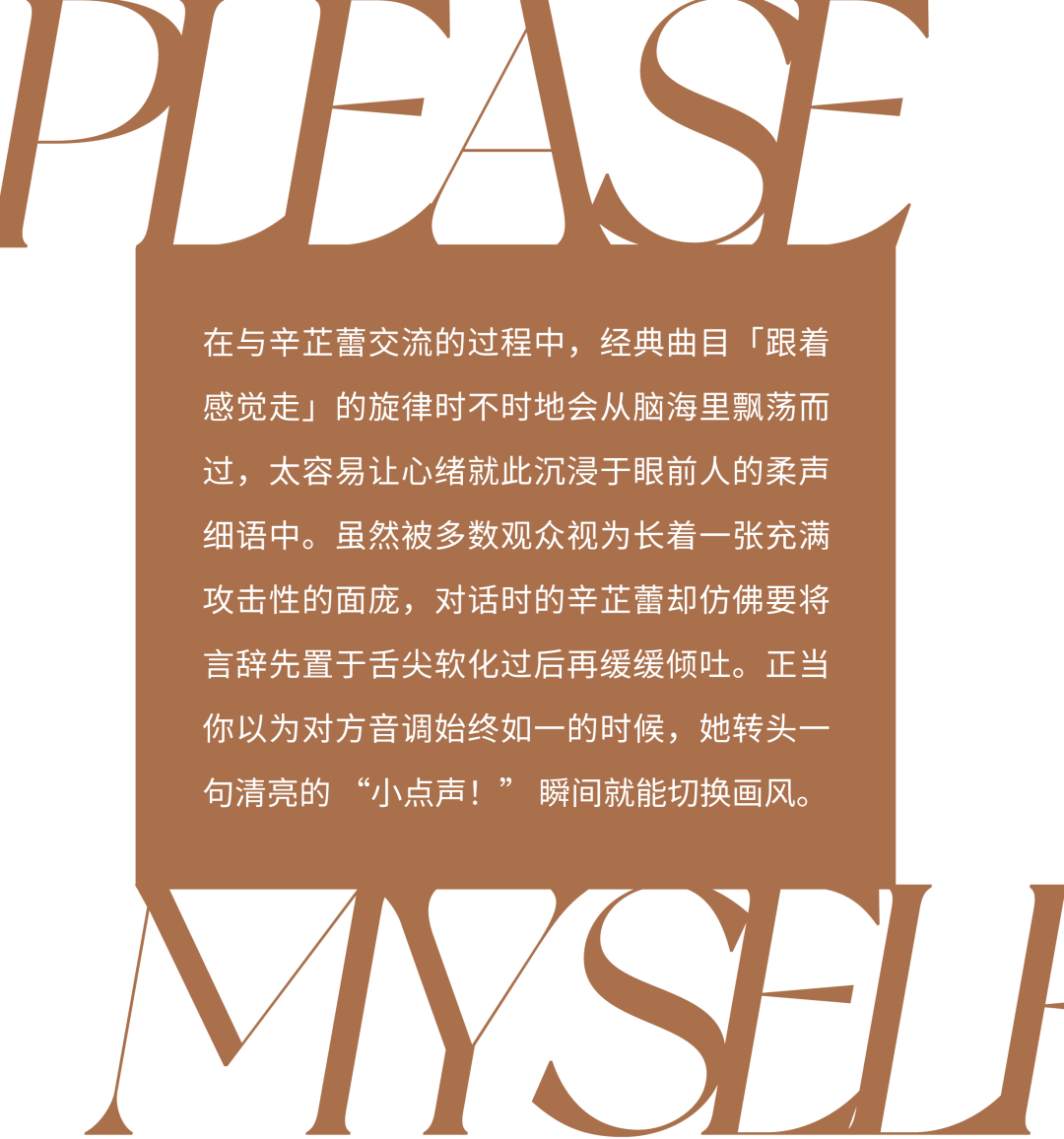 从前是接不到剧本无法规划,现今虽然选择权多,她也还是看感觉行事。提到“走向国际”的远大目标,辛芷蕾冒出了东北腔:“哎呀走啥呀,先走好国内吧。”现代女性总给自己贴上各种标签,到底应该具备什么特质?她觉得要自己说了算。饰演的角色大多充满力量感,那是她自身具备的力量,并不是说女性非要如此。“哪能因为一个时代的标签就定义所有人,每个人都应该更关心自己一点。你是谁?你想拥有什么特质?你应该干什么?”辛芷蕾连发三问,一次比一次坚定。“可能你外观世界能探索到月球,但你越探索就觉得越虚无,向内找一找或许会更不一样。”她一边找着,一边就看到了自身的局限性。大学还没毕业就开始做演员,除了上学时勤工俭学,辛芷蕾完全没有其它的职业经验。这导致她在观察身边职场女性时会惊讶,原来她们跟自己想象的或者剧本里写的根本不一致。强势?不是那样的。“这时我才想起来,哦,我没在职场待过。所以我还是偏向想象派,职场女性各种各样,我可能只是演出了其中某几种。”