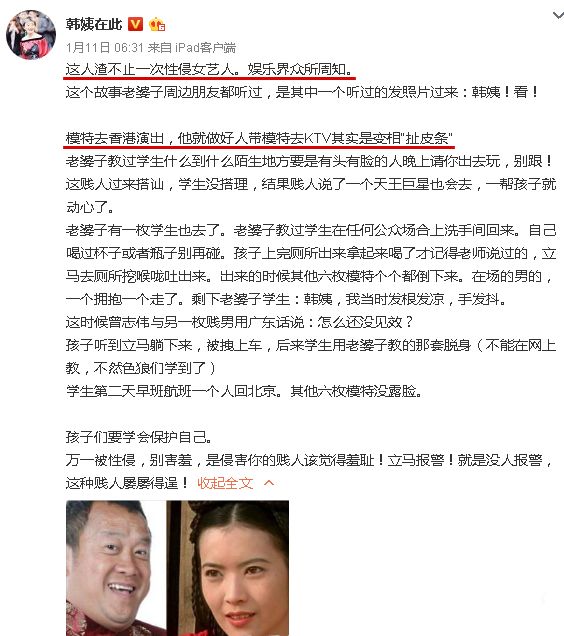 日前,“女模教母”韩颖华突然爆料曾志伟不止一次性侵女艺人,