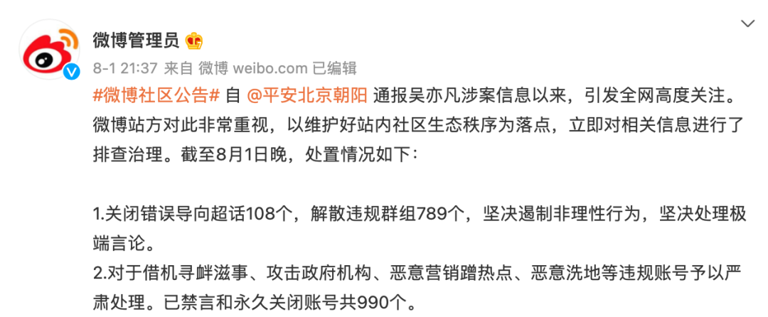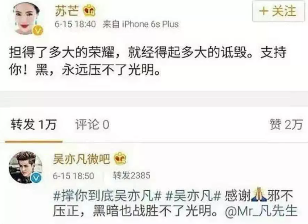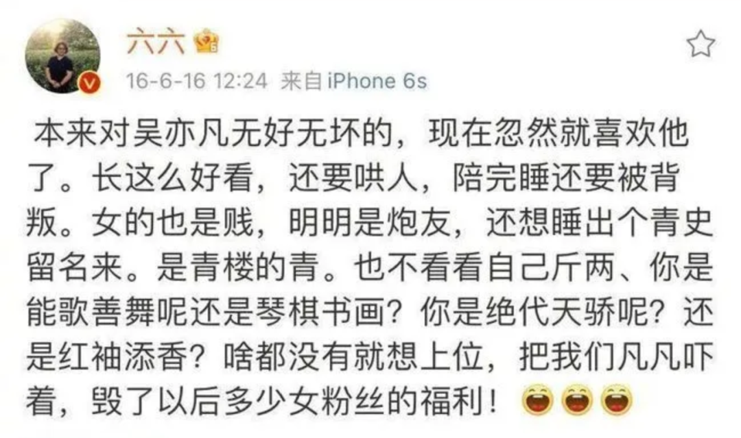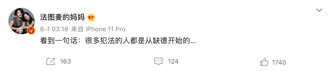吴亦凡被封杀后,3个女明星突然消失了…… 茜茜成长记 内地男星 2022-04-10 07:00:18 658 创作不易,用心坚持,欢迎请BaGua喝几杯爱心咖啡!打赏并支持本文 打赏并删除本文 来源 |十点读书会(ID:sdclass)去年,我们一起见证了娱乐圈的“历史性名场面”。 在吴亦凡被刑拘的第二天,全网封禁了和他相关的一切账户,包括微博、抖音、豆瓣以及各种视频、音乐平台。 惩罚力度之大,堪称历史性一刻。 查“吴”此人后,当时微博更是做了一次大清洗。 一次性关闭和禁言了990个账户,解散789个群,关闭错误导向的超话108个。图片来源:微博@微博管理员“借机寻衅滋事、攻击政府机构、恶意营销蹭热点、恶意洗地等”就是这些人的罪行。 但没想到的是,这990个人当中,还有3位女明星的微博也被禁言了。——苏芒、马薇薇、六六。 为什么呢? 因为,凡走过的路,必留下痕迹。凡做错的事,必受到惩罚。源头还要从16年说起。那时候,吴亦凡被曝出“小G娜事件”,一时间,娱乐圈哗然。 不知道这3位公众人物,出于什么目的,在事情没出结果之前,就纷纷站队,帮着吴亦凡指责女孩? 前时尚芭莎主编苏芒力挺吴亦凡说:“担得了多大的荣耀,就经得起多大的诋毁。” 图片来源:微博@苏芒辩手马薇薇偷换概念说:“还有什么比明星x粉更好的粉丝福利吗?”图片来源:微博@马薇薇编剧作家六六不仅支持吴亦凡,还侮辱举报的女孩说:“明明是炮友,还想睡出个青史留名来。是青楼的青”。 图片来源:微博@六六此等言论,伤害性极大,侮辱性也极强。不知,当她们说出这番话的时候,有没有一瞬间考虑过自己也是女性。如今真相大白,吴亦凡的德行担不起这么大的“荣耀”,而是“信守承诺”走进了监狱。当这些言论再次被扒出来,影响极其恶劣,见传播速度一发不可收拾,马薇薇不得不出来道歉。 视频截图来源:网络对于这种有目的性的道歉,网友并不买账。作为公众人物,不仅没有做好引导,还在大是大非面前玩文字游戏,最终的结局莫过于——自食其果。这件事也让我意识到:如果一个人三观歪了,大抵是因为利欲诱惑迷失了生而为人最重要的三个“心”。 道德心一旦丢失,人迟早会被毁掉。去年7月31日晚上10点,吴亦凡被刑拘的公告一出,舆论一片哗然。 看到有一则微博,简短利落,但正中要害。 李咏的妻子哈文发微博说: “很多犯法的人都是从缺德开始的……”图片来源:微博@法图麦的妈妈这句话不管是对吴亦凡,还是对于被禁言的名人、大众来说,恐怕都要警醒。 事实证明,道德心一旦开始缺失,道德的底线就会一降再降,直到毁了自己。 上一个从缺德,到击穿底线的明星,还是郑爽。 从郑爽出道以来,经常能看到她乱扔烟头,说脏话,不敬业等品行恶劣的热搜。 甚至有一次,她被发现偷拿节目组的道具,还挂到二手交易网上去卖钱。图片来源:网络 但那时,大家都觉得她只是道德上有瑕疵,并不是什么大问题。 大众的纵容,粉丝的追捧,让郑爽尝到了破坏道德规则的甜头。 郑爽在节目中得意洋洋的说:“我每上一次热搜,片酬就会涨。”图片来源:网络不管是被骂还是被夸,只要有流量,就能让日薪再上一层楼。 后来郑爽又被爆出,她在超市里吃东西从来不结账,把生病的小狗放到鞋盒里扔掉,这些真正缺德的行为。 这时候大家才发现,郑爽的道德问题已经不是小偷小摸。 而是她彻底丧失了道德底线,成为了无视规则,漠视生命的人。 正如古训所说,上天欲其灭亡,必先令其疯狂。 去年初,郑爽代孕弃养的新闻一曝光,成为第一位被公开封杀的内娱明星。广电时评中有一段话,至今听来也是振聋发聩: “演艺人员私德有亏,无论作品如何,其本人在广播电视和网络视听上的社会公德示范作用不会积极正面。” 至此,郑爽的演艺事业彻底崩塌,永无再复出的机会。 如易中天所说: 一个人,没了底线,就什么都敢干。一个社会,没了底线,就什么都会发生。不管是明星偶像,还是我们普通人,都要“做事先做人,学艺先学德”。守住道德心,永远是最重要的底线。 没有同理心的人,是不会有朋友的。曾经六六的儿子问过她: “2016年你为何那样评论吴亦凡的事,那样多伤害女孩,你自己也是女孩呀?” 六六哑口无言。 连她的儿子都知道,她说的话会伤害到女孩,而女孩更不应该伤害女孩。 但是六六却失去了这颗同理心,让她站在了大众的对立面。图片来源:微博@娱乐有饭所谓同理心,是能够设身处地的理解他人的痛苦,能够换位思考,将心比心。 而有同理心的人,懂得理解他人,善于赞美、鼓励、谅解、扶持。 一旦失去同理心,人就会失去善意,变得喜欢挑剔、抱怨、责备、嘲讽。 就像现在网络上这样,充满戾气,相互攻击。 就在六六发出不当言论的同一年,还有一个女孩善意帮助女孩的事件,让我们感慨到现在。 2016年包贝尔结婚,邀请了圈内众多好友前来参加婚礼。 仪式进行到了一半,居然闹起了伴娘。 穿着裹胸纱裙的柳岩,被几个男明星握住双手双脚抬了起来,就要被扔到旁边的泳池里。这时候,多亏了善良的贾玲出手相救,坚定地坐在柳岩前面,护着柳岩不被抬走。图片来源:网络 都说贾玲代表了国民女明星好感度的天花板,大家都觉得她善良,情商高。 这些优点背后的深层原因,其实是贾玲有同理心,能够换位思考,理解和尊重所有人。 只有贾玲意识到,柳岩不想被推下水。 也只有贾玲愿意挺身而出,救下了柳岩,也救下了尴尬