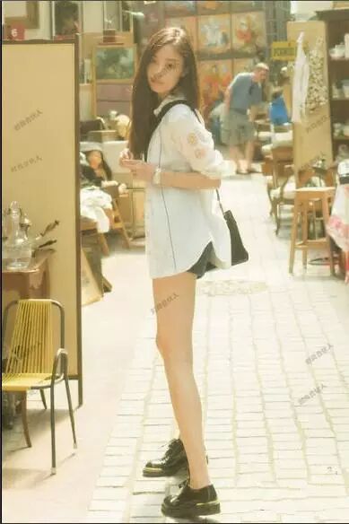 一直挪不开眼,因为大长腿实在是太美。宽松的印花白衬衫,微微漏出牛仔热裤的裤边,配上带有金属元素的系带小皮鞋。