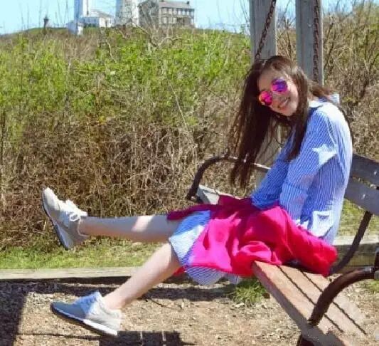 裙子是每个女孩儿的少女梦,蓝色竖条纹翻领连衣裙一上身,甜美度爆棚,再配上一条艳丽的披肩,秋千椅上的轻松惬意和远处的蓝天白云交相辉映。