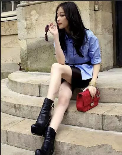 休闲的蓝色衬衫罩上酷酷的皮裙,再踩上一双厚底骑士靴,就算是有着一张典型东方美女脸的倪妮,都立马转型成大气的女王。
