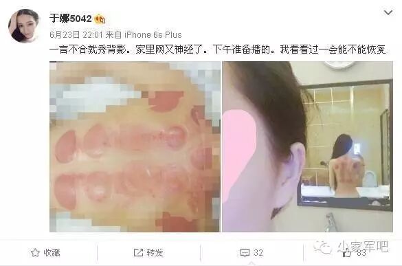 今日,于娜更新了一则微博,博文中附上了2张拔完火罐后的背部图!估计身体有所不适吧,只见后背留下的深深的罐印~~~图2中手机自拍后方的镜子中展现出于娜姣好身材!其背身体曲线玲珑优美,好生诱人!见此美景的粉丝纷纷留言评论,除若干人表达关心询问外,!更多的则是大呼其身材完美!