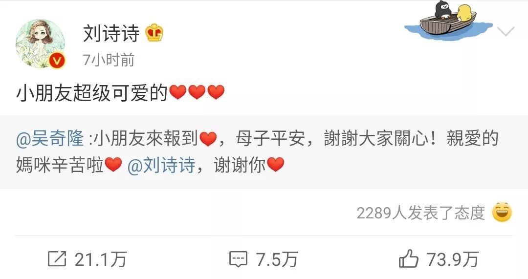 今天一大早,网上就被“刘诗诗生子”刷屏了。