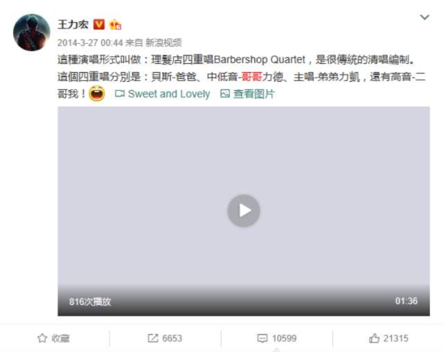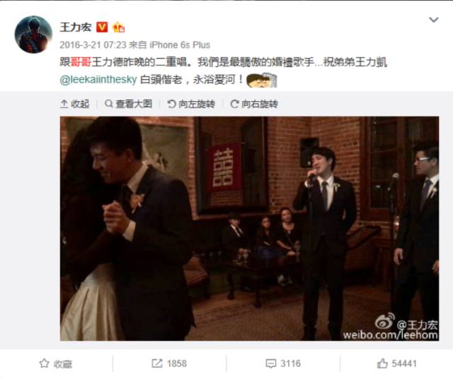 上一年弟弟王立凯结婚,第一次当婚礼演唱嘉宾的王力宏兴奋了很久。晒出了一张与哥哥献唱的照片:“跟哥哥王力德昨晚的二重唱”。我们是最骄傲的婚礼歌手,祝弟弟王力凯白头偕老,永浴爱河!”