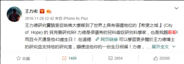 微博中还透露了哥哥的实验室从哈佛大学搬到了“希望之城”,将在那里进行癌症治疗方面的研究。