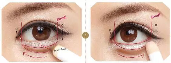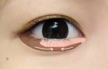 用遮瑕膏打底后,首先在眼睛下方5-7mm的地方涂抹阴影,然后在眼头和眼中下方用高光提亮,注意在两端逐渐减弱哦。