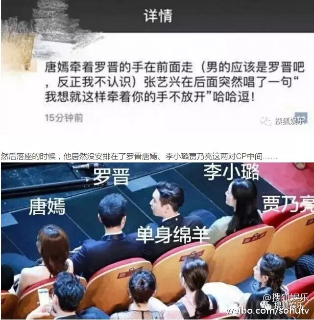 唐嫣罗晋在公开恋情后频频合体各大盛典晚会,一次晚会张艺兴被安排在他们旁边,然后唐嫣和罗晋牵手在前方走,张艺兴在后面唱了一句“我就想就这样牵着你的手不放开”。