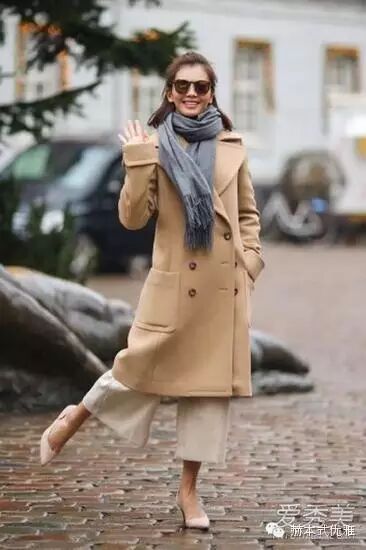 私服街拍,驼色大衣配九分阔腿裤和灰色围巾,脚踩尖头高跟鞋,优雅时尚,尽显女人味。