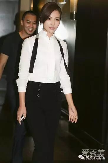 又是黑白配,她总会选择带点设计感的白衬衫,就比较个性了,配黑色高腰裤干练利落,看着很高挑。
