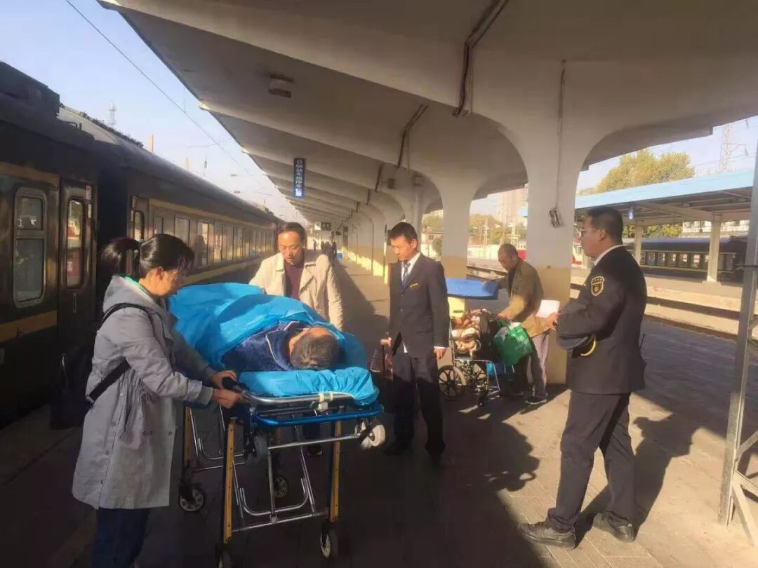 晨光笼罩,爱满人心。西安火车站工作人员携手相助,无微不至,将刚完成手术的郑伟抬至担架上,家属现场表示由衷感谢。